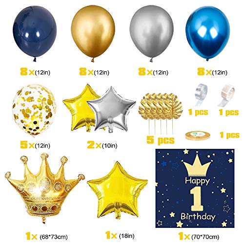 💎【Baby 1. Geburtstag Deko Set】: 12 Zoll Metallballon x 24 (Gold x 8, Silber x 8, Blau x 8), goldener konfetti ballon x 5, Kronenfolienballon x 1, silbergoldener Sternfolienballon x 3 (18 Zoll, 10 Zoll), goldener Regenvorhang x 1, Geburtstags poster x 1, goldenes Schildkrötenblatt x 5, Ballonkette, Klebepunkt, Goldband. Ein umfassendes Sortiment an Geburtstagszubehör ermöglicht es Ihnen, Geburtstags dekorationen einfach zu vervollständigen.