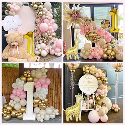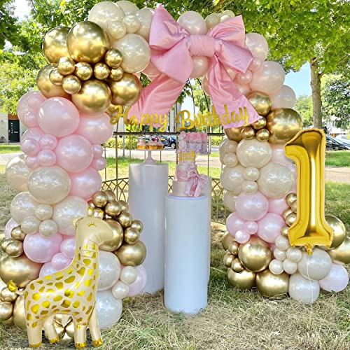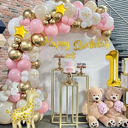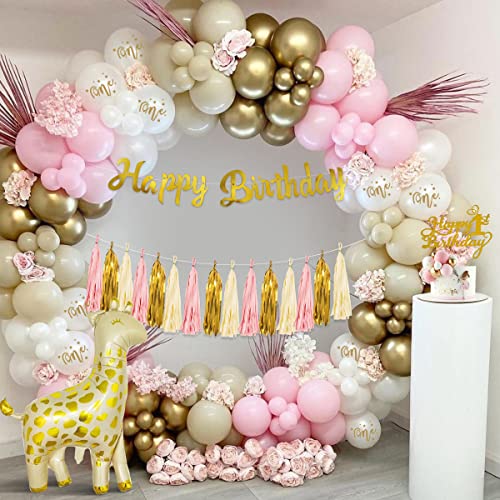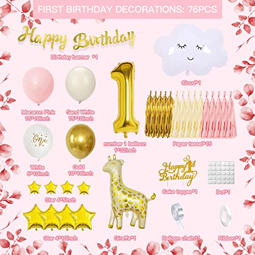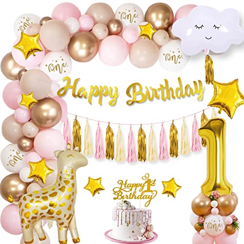 Geburtstagsdeko mädchen 1 jahr: Inklusive 40 x 10 zoll latexballons (macaron rosa, gold und sandweiß), 5 bedruckte weiße luftballons, happy birthday banner, tortenaufsatz zum 1. Geburtstag, gold folienballon nummer 1, giraffen ballon, wolken ballon, 4 x 10 zoll sternballons, 4 x 5 zoll sternballons, 15 stück papierquasten, band, ballonstreifen, klebepunkte.