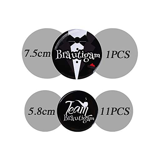 Lieferumfang: 12 Stück JGA Buttons, ein für Bräutigam und elf Buttons für Seine Crew zur Bachelor Party.