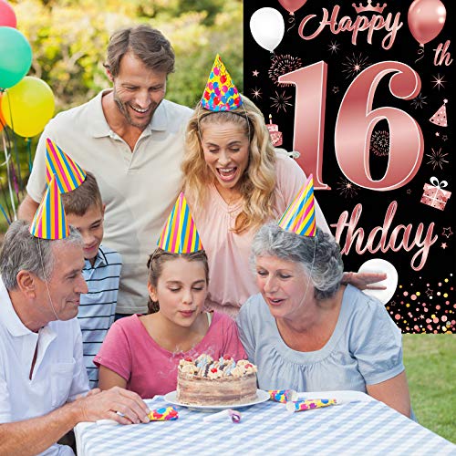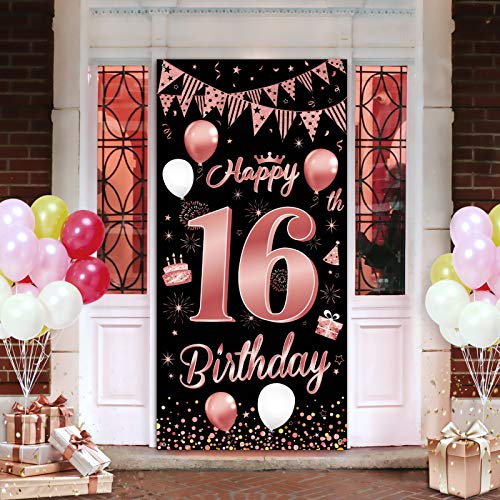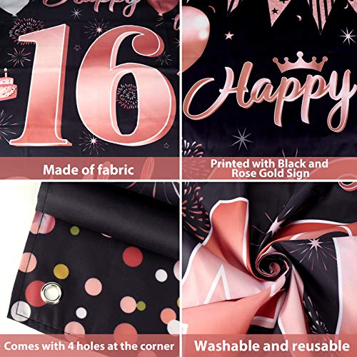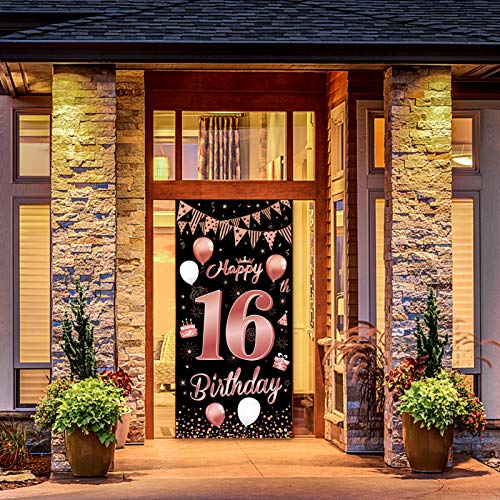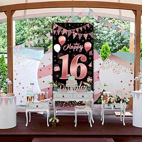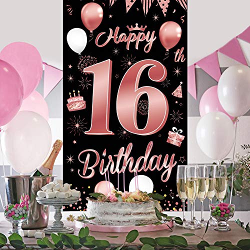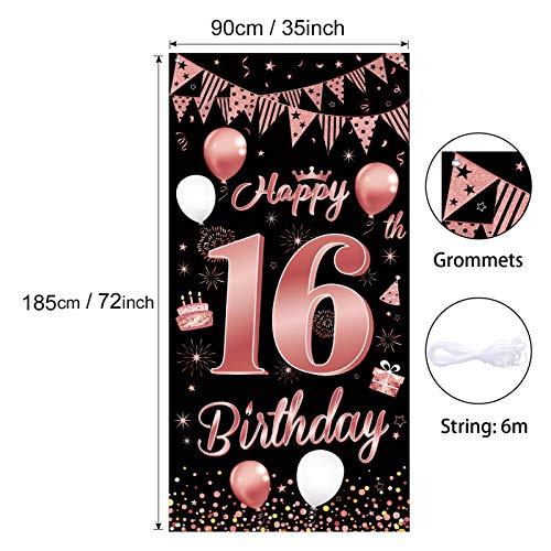 【Fantastische Dekoration zum 16. Geburtstag】Es handelt sich um ein speziell entworfenes Türverkleidungsbanner für die 16. Geburtstagsfeier von Mädchen. Edles Schwarz als Basis, elegantes Roségold als dekoratives Muster. Gedruckt mit Luftballons, Kuchen, alles Gute zum 16. Geburtstag und anderen Partyschildern, Voller Vitalität und Spaß.