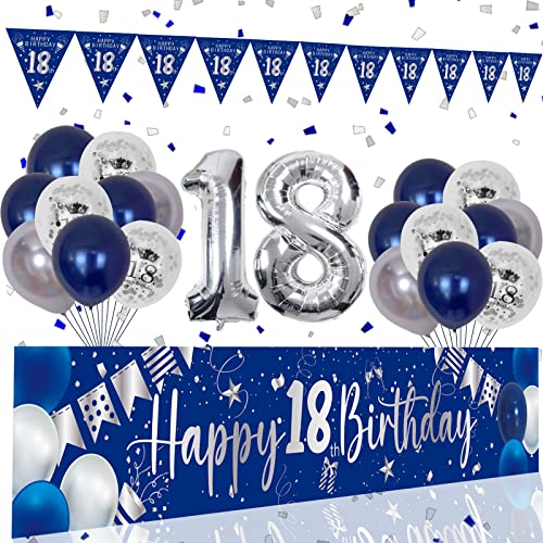 ✨ 【Deko 18. Geburtstag Set】- Einbeziehen 1 stück 250*40cm gegorous blauen Banner Hintergrund, 32 Zoll Folie Ballon Nummer 18, 8 stück 10″ blaue Latex-Ballons, 4 stück 10″ silberne Latex-Ballons, 6 stück 12″ Printed 18th Cofetti Ballons, 11 stück blau Silber Wimpel. Alles, was Sie brauchen, um eine schöne 18. Party für Ihren Sohn, Ihre Tochter, Ihren Freund oder Ihre Familie zu dekorieren.