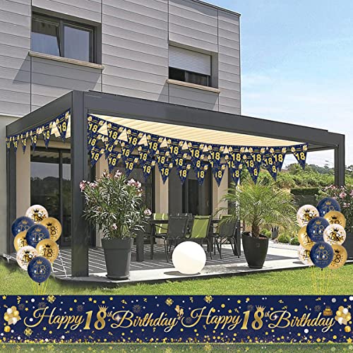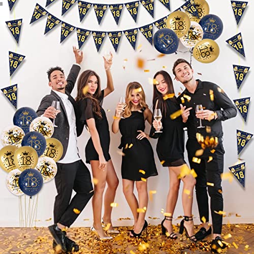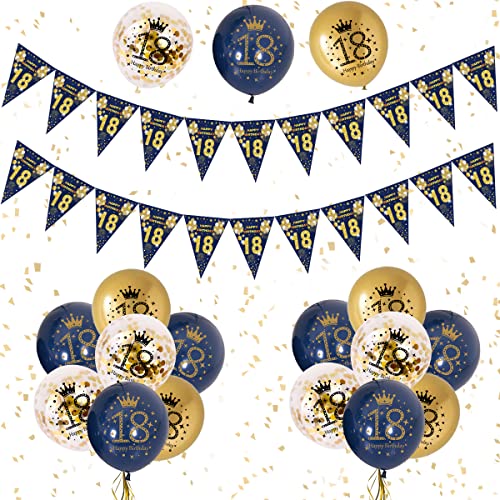Banner zum 18. geburtstag: Sie erhalten 2 sets marineblauer banner zum 18. Geburtstag (jedes banner enthält 11 stück), 5 stück marineblaue luftballons, 5 stück konfetti-ballons, 5 stück goldene luftballons, 1 stück bänder.