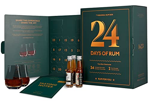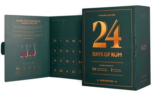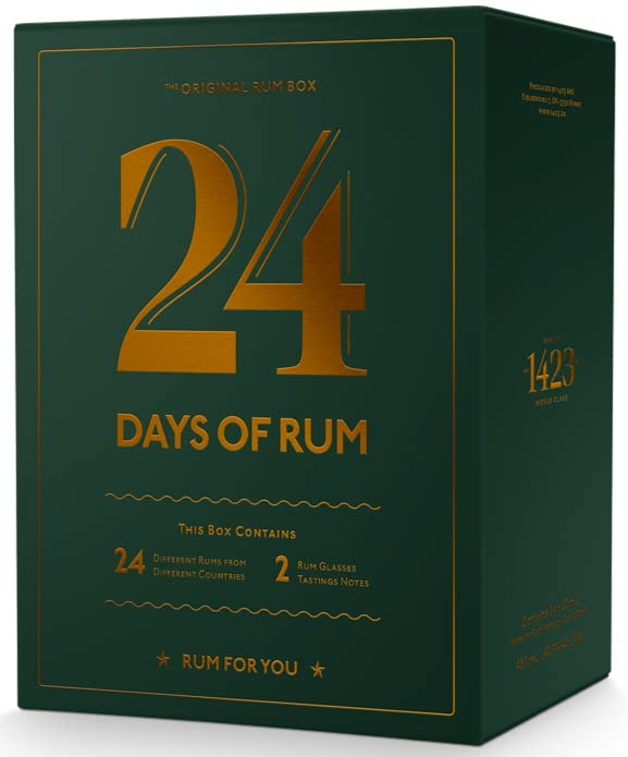 Sie haben 1 Box mit 26 Türen. Hinter den ersten beiden Türen finden Sie ein Degustationsglas, und hinter den mit 1 -24 gekennzeichneten Türen finden Sie eine kleine 2 cl Miniaturflasche mit reichlich Rum für den Tag. Jeden Tag probieren Sie einen neuen Rum aus einem anderen Land. Die Miniaturflaschen haben speziell gestaltete Etiketten mit dem Originalmarkenlabel sowie einer Infobox.