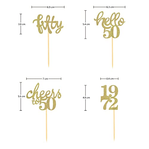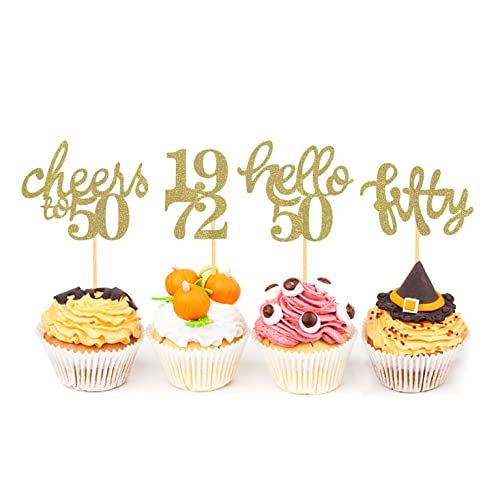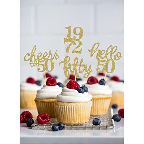 【Lieferumfang】 24 Stück Cupcake Toppers in 4 verschiedenen Stilen, einschließlich „cheers to 50“, „1972“, „hello 50“ und „fifty“. Sie können mit verschiedenen Arten von Cupcake kombiniert werden, um Ihre Torte noch attraktiver zu machen.