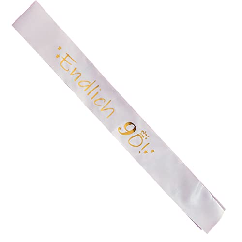 ❤Die Schärpe ist in Weiß und hat eine goldene Schrift „Endlich 90!“ im Metallic-Look. und es ist 9,5 cm breit und 80 cm lang.