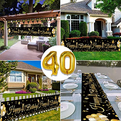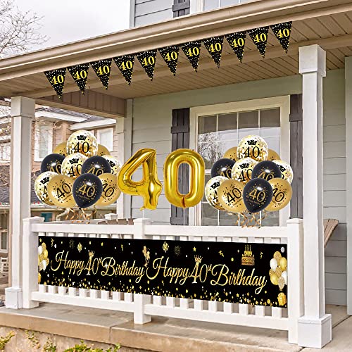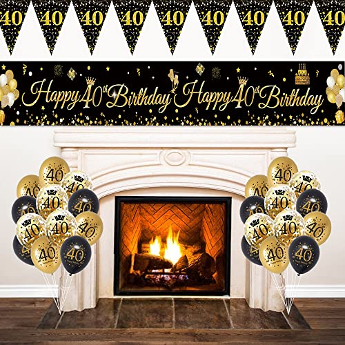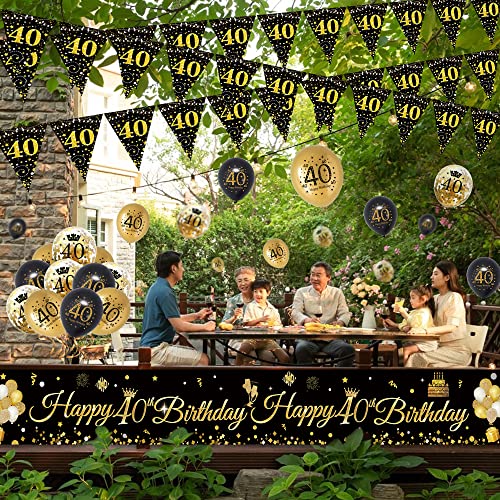 40 GEBURTSTAG DEKORATIONEN: Sie erhalten 1 extra großes schwarz-goldenes Happy 40. Geburtstagsbanner (Größe: 9 * 1,2 Fuß), 1 doppelseitig bedruckte Dreiecksflagge mit 11 Flaggen und 15 bedruckte Ballons (5 Stück metallisch goldene Luftballons, 5 Stück schwarze Luftballons, 5 Stück goldene Konfetti-Ballons), 32 zoll folienballon number 40.