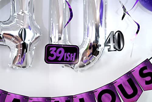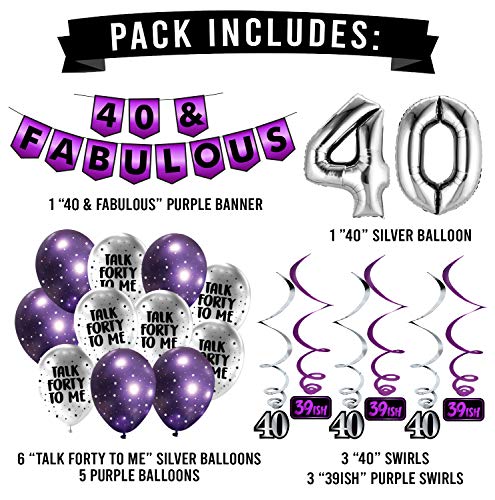 PACKUNG: Die Packung erhält einen silberne „40“ Luftballon (100cm), 1 Banner aus glänzender Folie in Lila, 6 TALK FORTY TO ME Latexluftballons aus Metallisch Glänzender Silberfolie und 6 SHITS GETTIN‘ REAL Latexluftballons aus Metallisch Glänzender Folie in Lila und 6 silberne & lila Spiralgirlanden.