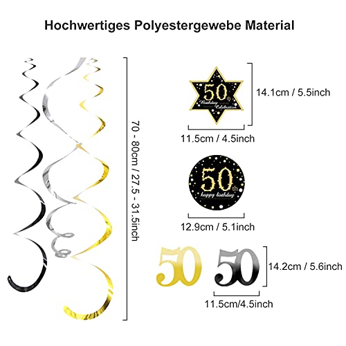 【50. Geburtstag Dekoration Spirale Deko】Insgesamt 8 Schwarz Gold 50 Geburtstag PVC Swirl Spiralen als Deckenhänger. Hergestellt aus glänzendem Folienmaterial. Jeder Wirbel mit einer Plastikschlaufe oben zum einfachen Aufhängen. Lustige Dekoration für Ihre 50. Geburtstagsfeier.