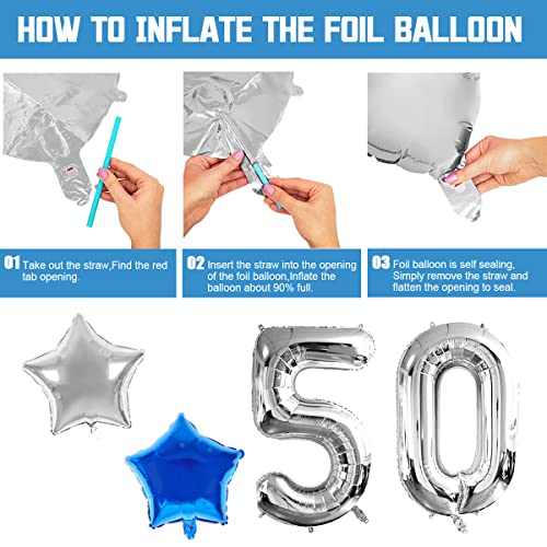 【50. Geburtstags Dekorationen】Die Partydekorationen zum 50. Geburtstag für Männer umfassen ein 50. Geburtstags banner, 32 „Folienballons Nummer“50″, 1 x 18″ Silberne Pentagram,1 x 18″ Blaue Pentagram, 12″ Latex Ballon (Nachtblau * 15, Metallic Blau * 10, Metallic Silber * 10, 50 Jahre Konfetti Ballon * 6), 5“ Latexballon (Nachtblau * 10, Blau * 10, Silber * 10), 50 Jahre Tortendekoration, Party Tischdecke, Ballonband, Ballonbogenband.