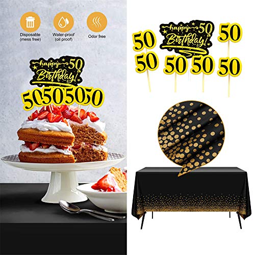 🎈 TISCHDECKEN+13 CUPCAKE TOPPER + 12 PAPPTELLER: Schwarz und Gold Kunststoff-Tischdecken für rechteckige Tische, Spaß und bunten Happy Birthday Party Cupcake Topper, Hinzufügen von Fröhlichkeit zu Ihrem Kuchen und Snack in der Partei! Geeignet für normale und Mini Cupcakes, machen Sie die Reinigung einfach mit Einweggeschirr, Dies ist nicht essbar, nur für die Dekoration, bitte verwenden Sie es nicht in den Ofen oder Mikrowelle.