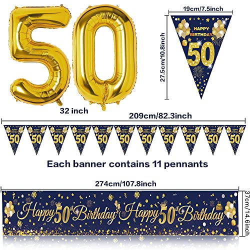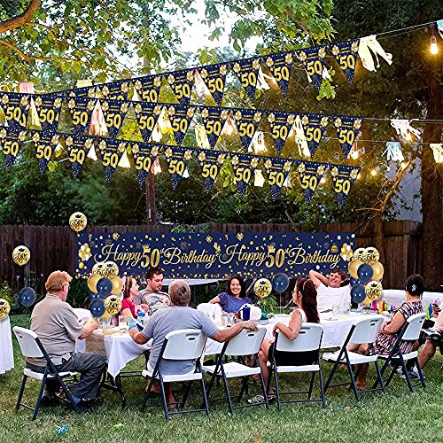 ✨ 【50 GEBURTSTAG DEKO KITS】- Enthalten 1 stück brillante Blau Gold Banner, 32 zoll folienballon number 50, 11 stück Blau Gold wimpel 18*13cm, 6 stück navy blau luftballons 12 zoll, 6 stück gold luftballons and 6 stück gold konfetti luftballons 12 zoll, ein 13 fuß seil und unser freundlicher Kundendienst.(banner größe: 274*37cm / 9*1.21 Füße.)