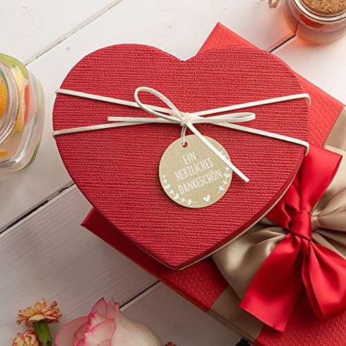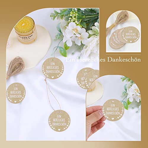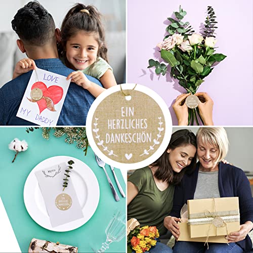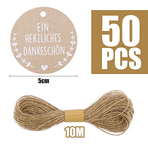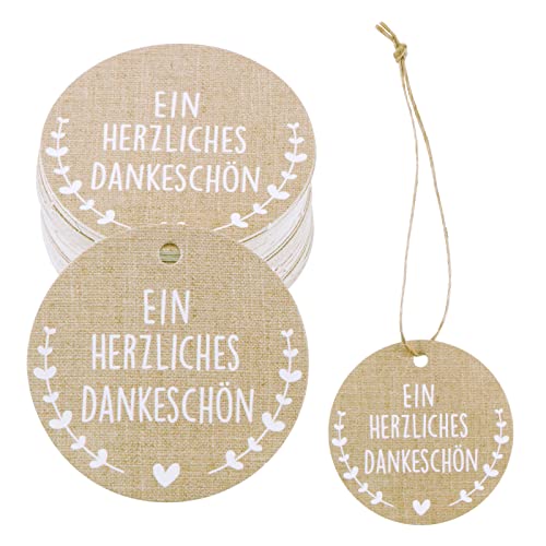 Lieferumfang: 50 pcs runde Geschenkanhänger „Ein herzliches Dankeschön“ in Jute-Optik und 1 Rolle 1mmx10m Schnur.