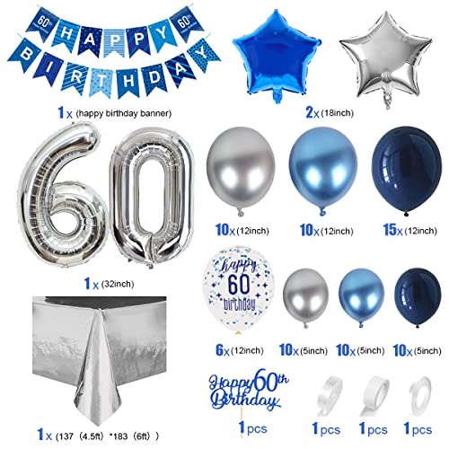 【60. Geburtstags Dekorationen】Die Geburtstagsdeko 60. Geburtstag für Männer umfassen ein 60. Geburtstags banner, 32 „Folienballons Nummer“60″, 1 x 18″ Silberne Pentagram, 1 x 18″ Blaue Pentagram, 12″ Latex Ballon (Nachtblau * 15, Metallic Blau * 10, Metallic Silber * 10, 60 Jahre Konfetti Ballon * 6), 5“ Latexballon (Nachtblau * 10, Blau * 10, Silber * 10), 60 Jahre Tortendekoration, Party Tischdecke, Ballonband, Ballonbogenband.