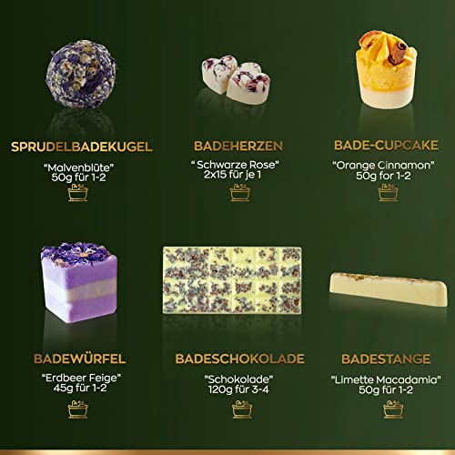 🎁LUXURIÖSES FRAUEN GESCHENK FÜR EINZIGARTIGE MOMENTE DER ENTSPANNUNG – Unsere Bio Badekugeln sind von höchster Qualität. Dies gilt für die verwendeten Inhaltsstoffe sowie für die präzise Fertigung der einzigartigen Badebomben per Hand. Oase der Sinne ist ein 7-teiliges Geschenkset für Frauen mit den Düften: Malvenblüte (Sprudel), Orange-Zimt, Limette-Macadamia, Erdbeer-Feige, Schokolade & Schwarze Rose. Als Geschenke für Mama eignen sich die hübschen Badekugeln besonders gut.