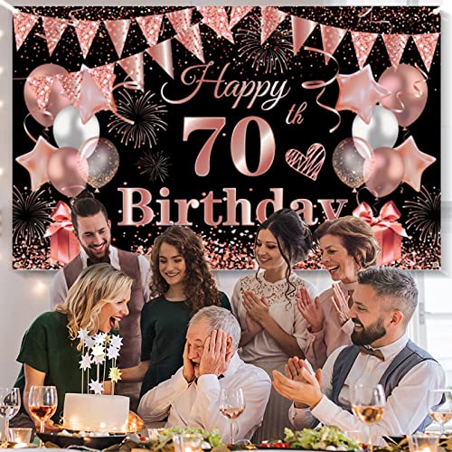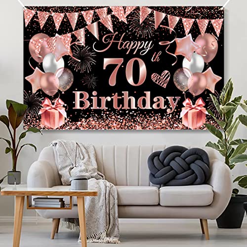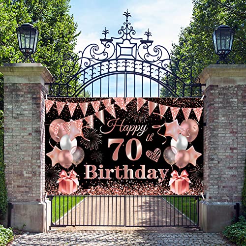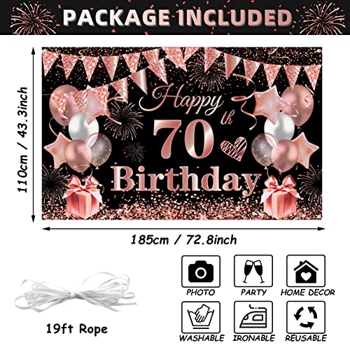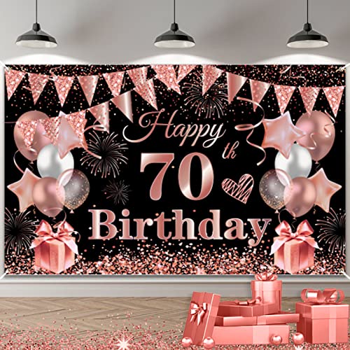 ✨ Spezielles Design: Das Schwarz Roségold Banner-Design mit Roségold weiß Luftballons, Feuerwerk, dreieckigen Flaggen, Bändern, silbernem Konfetti, „Happy 70th Birthday“ Worten und mehr. Schaffen Sie eine brillante fröhliche Atmosphäre auf der 10. Geburtstagsfeier.