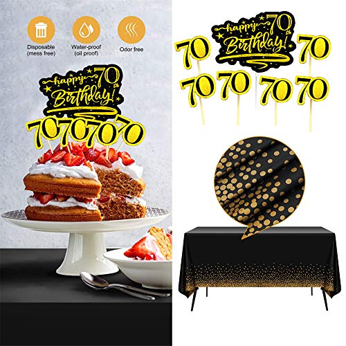 🎈 TISCHDECKEN+13 CUPCAKE TOPPER + 12 PAPPTELLER: Schwarz und Gold Kunststoff-Tischdecken für rechteckige Tische, Spaß und bunten Happy Birthday Party Cupcake Topper, Hinzufügen von Fröhlichkeit zu Ihrem Kuchen und Snack in der Partei! Geeignet für normale und Mini Cupcakes, machen Sie die Reinigung einfach mit Einweggeschirr, Dies ist nicht essbar, nur für die Dekoration, bitte verwenden Sie es nicht in den Ofen oder Mikrowelle.