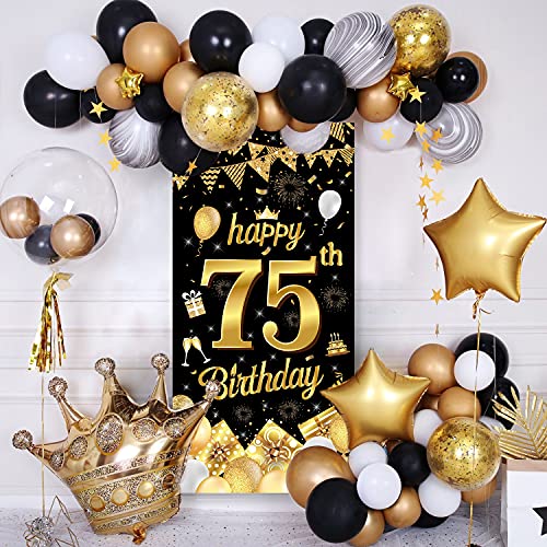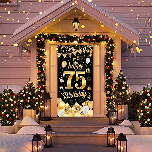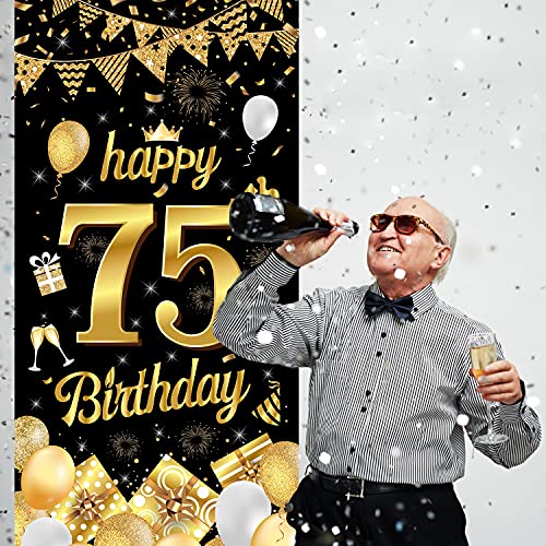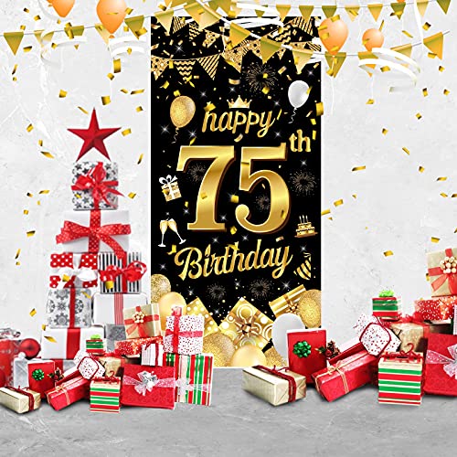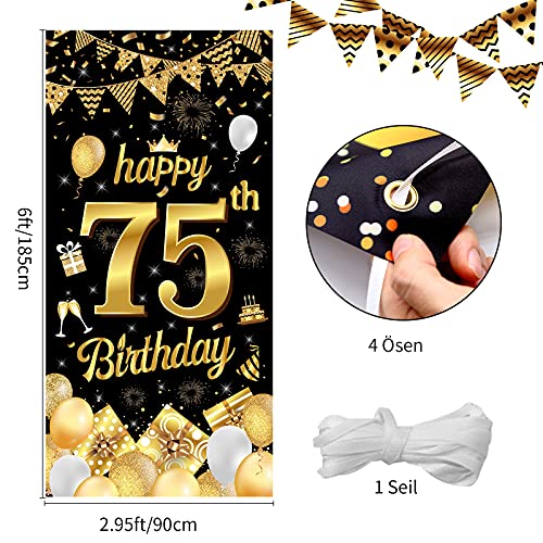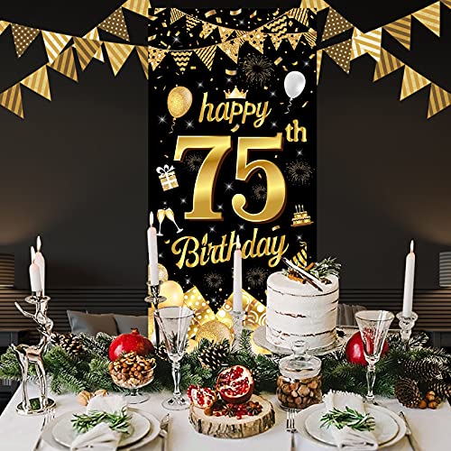 AUGENBLICKENDE GEBURTSTAGS DEKO: Das Geburtstags banner zeigt eine große, glänzende Zahl „75“ und viele fröhliche Geburtstags elemente. Die Muster sind in hoher Auflösung gedruckt und passen gut zu den Farben Schwarz und Gold. Ideal, um eine wunderbare Atmosphäre für Ihre Geburtstagsparty zu schaffen und alle Ihre Gäste zu beeindrucken!
