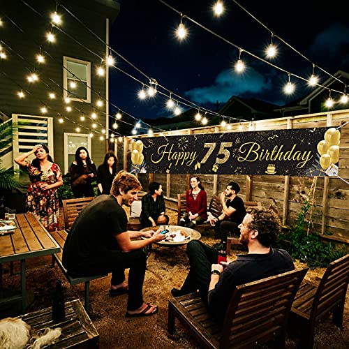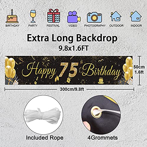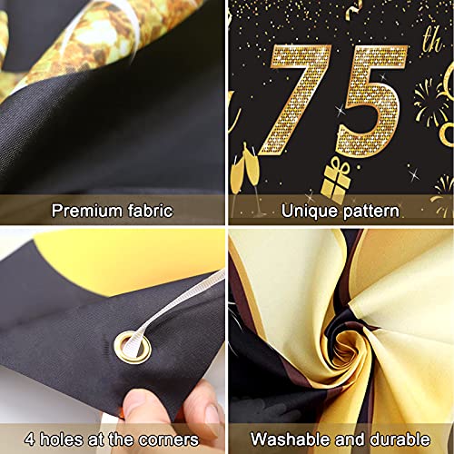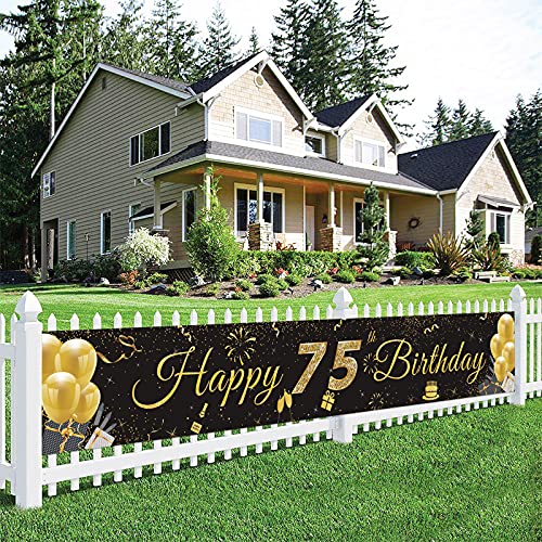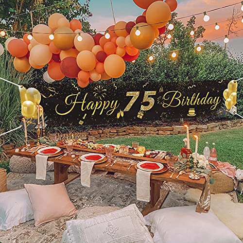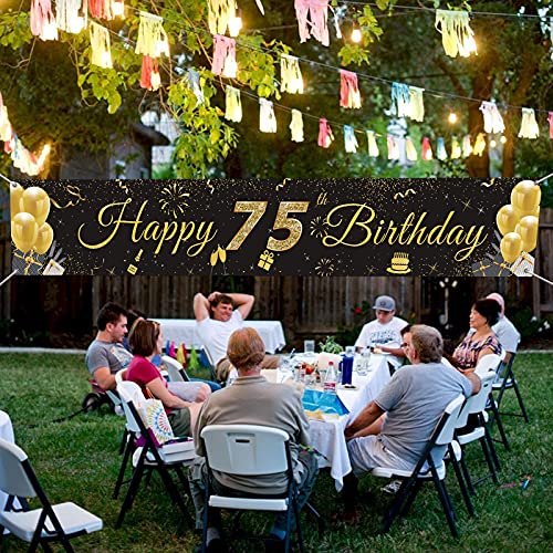 SCHWARZ GOLD PARTY DEKO: Das Banydoll Banner Happy Birthday zeigt ein großes „75“ schild und viele festival elemente. Die schwarz goldene farbe passt gut zum Geburtstagsaufdruck und trägt erheblich zu seiner Struktur bei. Es wird eine fantastische Geburtstagsdekoration sein, um eine fröhliche Atmosphäre für Ihr großes Ereignis zu schaffen und alle Ihre Freunde zu beeindrucken!