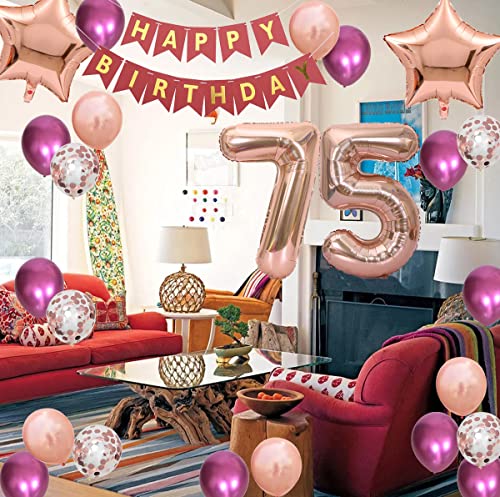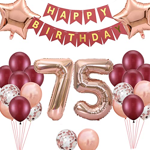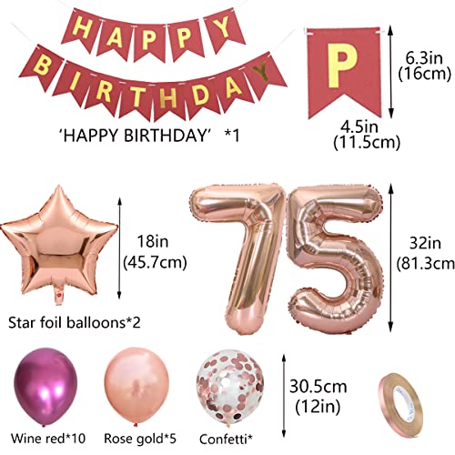 75.Geburtstag Dekorationen enthalten: 1 * 14 „HAPPY BIRTHDAY“ Briefbanner mit Blasrohr, 1 * Nummer 75 Folienballons, 2* Sternfolienballons in rosaroter Farbe, 20 Latex-Partyballons in 3 Stilen (10 * weinrote Farbe, 5* roségoldenes Konfetti, 5* roségold), 1* 10m roségoldenes Band. Insgesamt 26 Packungen in einem Paket. Es enthält alles, was Sie brauchen, um Ihre Geburtstagsfeier zu feiern.