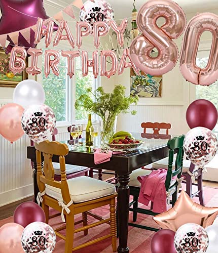 Details: 80. Geburtstag Dekorationen Weinrot Roségold für Frauen, Happy Birthday Ballon Wimpel Banner Nummer 80 Geburtstag…