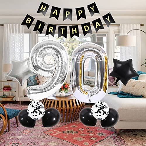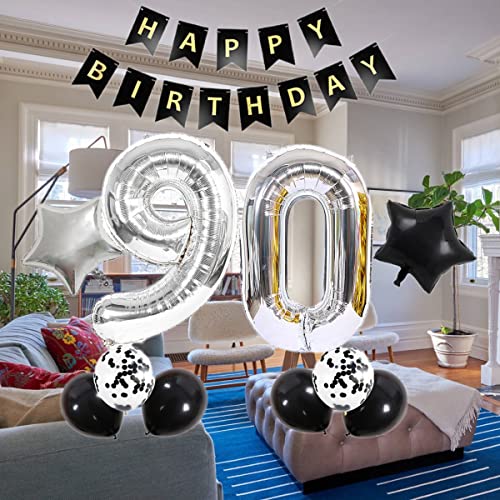 Dekoration zum 90. Geburtstag schwarz silber: Enthält 40 Zoll digitale „90“-Folienballons + Happy Birthday-Girlande + 4 Latexballons + 2 Konfetti-Ballons + 2 Stern-Folienballons (18 Zoll) + Ballonbänder + Ballonstroh.