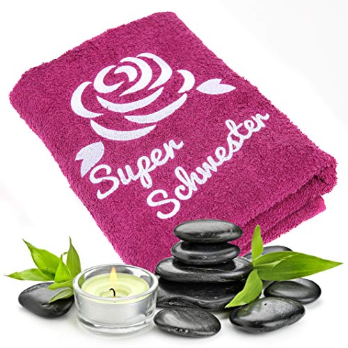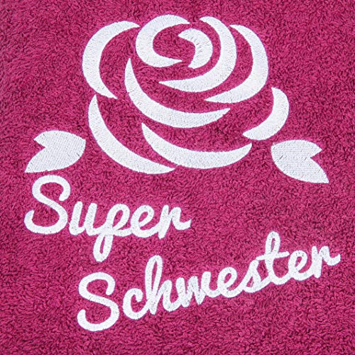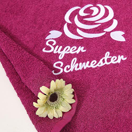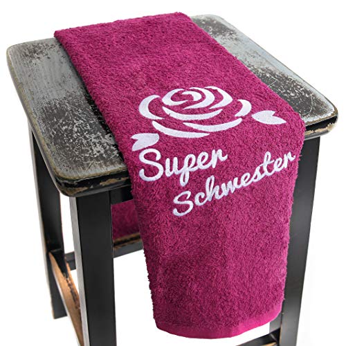 Wunderschön farbiges Handtuch in einer schönen dunkelvioletten Farbe mit zarter Stickerei einer Rose und mit sorgfältig gestickter Aufschrift Super Schwester wird ein sehr beliebtes Geschenk sein und wird bald einen Platz in Heim und im Herz Ihrer Schwester finden.