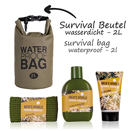Der praktische Lieferumfang beinhaltet 200ml Pflegedusche, 75ml after Shave, Handtuch 30 x 30 cm, alles verpackt in einer Drybag (Volumen 2L) im Camouflage Look