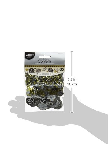 Dieses Konfetti besteht aus kleinen Kreisen, Stäbchen, Sternen und der Ziffer „80“ in den Metallic-Farben Gold, Silber und Schwarz. Es wird in einer 34 g Tüte geliefert