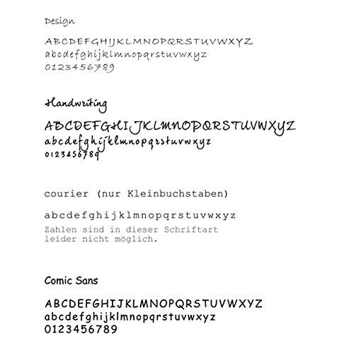 – Schriftart: Handwriting (Schrift des Modells), Design, Comic Sans MS, Courier (nur Kleinbuchstaben)