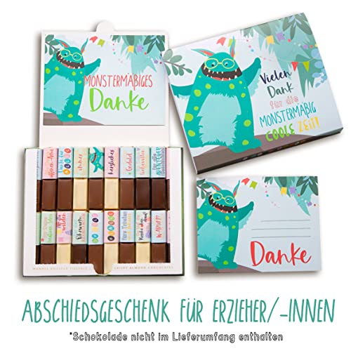Du möchtest mit einer herzerwärmenden Aufmerksamkeit ein Dankeschön zum Abschied an die Erzieherin oder den Erzieher überreichen? Hier findest du die ideale Lösung. Mit unserem Aufkleber-Set gelingt dir das mit nur wenigen Minuten Aufwand, und sieht garantiert klasse aus. Die stabile Banderole ist perfekt zugeschnitten und genutet für eine 250 g Merci Schokoladen Packung und du musst nur noch den Schutz auf den Klebestreifen abziehen. Mit unseren vorgedruckten Aufklebern kannst du die Schokoriegel perfekt verzieren und jedem eine kleine Botschaft als Danke mitgeben. In weniger als 15 Minuten wird aus einer gewöhnlichen Schokobox eine ideale Geschenk-Idee über die sich jede Erzieherin, Kinderpflegerin, Betreuerin oder der ganze Kindergarten von Herzen freut. Basteln ohne zeitintensives ausdrucken, ausschneiden und hantieren mit Klebstoff. Leicht umsetzbar: Auf die Deckelinnenseite kannst du je nach belieben eine der beiden Postkarten anbringen. Die Rückseite der Kartonbanderole bietet genügend Platz, sodass die gesamte Kindergartengruppe unterschreiben kann. ACHTUNG: Du erhältst nur die Aufkleber. Pralinenschachtel mit Schokolade bzw. Merci ist im Lieferumfang nicht enthalten.