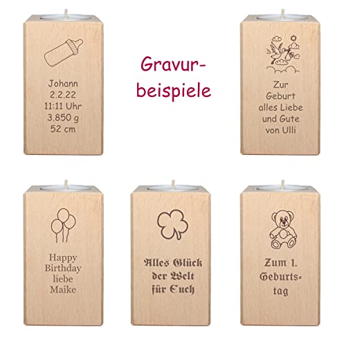 Geschenk für Jungen und Mädchen: Der Kerzenträger ist eine neutrale Alternative zu Blau und Rosa. Auf dem naturbelassenen Holz gibt es in fünf Zeile genug Platz um Glückwünsche, Name, Gewicht, Größe oder lustige Babysprüche zu gravieren.