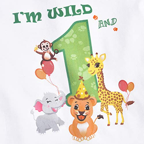 👕【Einzigartiges Design】 – Safari Dschungeltiere Thema Geburtstagsfeier T-Shirt mit einem niedlichen Löwenelefanten Giraffenaffe und dem Text Ich bin wild und eins mit einer großen Nummer 1. Alle Tiere, die du magst, sind auf der Kleidung. Herzlichen Glückwunsch zum Geburtstag!
