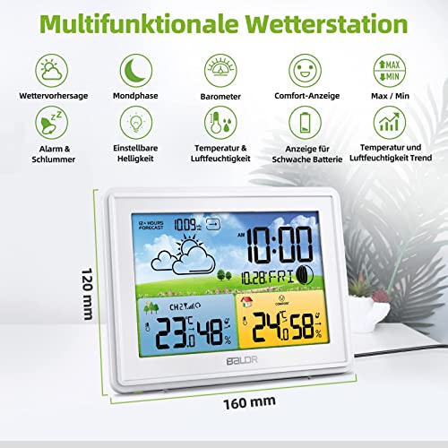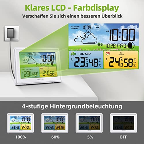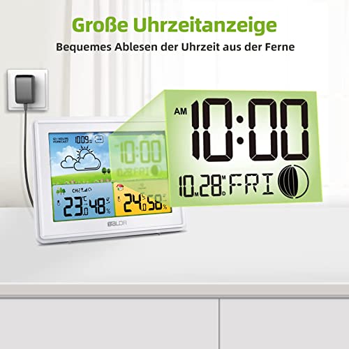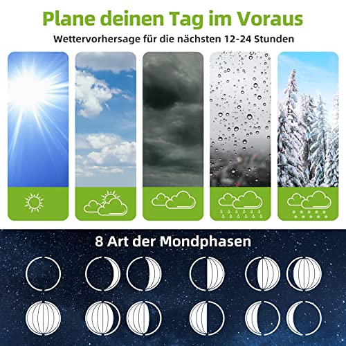 🌦Multifunktional Funkwetterstation: Wetterstation mit Vorhersage von acht Mondphasen und Wettertrends. Arbeit als Nachtlicht, Kalender, die aktuelle Zeit kann in 12/24 und so weiter eingestellt werden. Diese Wetterstation Funk ist eine gute Idee als Geschenk für Ihre Familie oder Freunde. (Stromversorgung nur über Adapter)