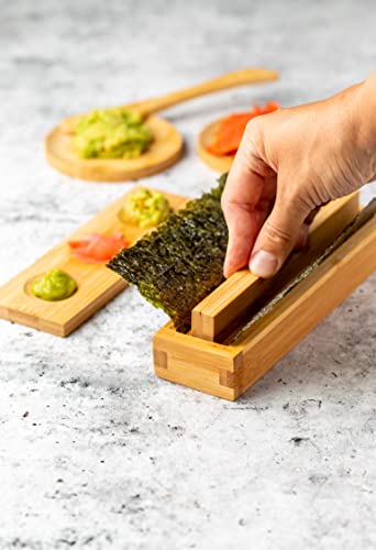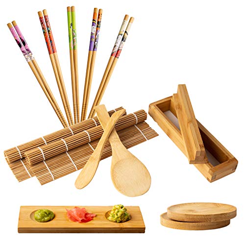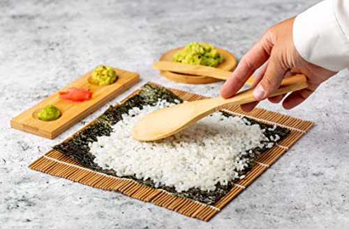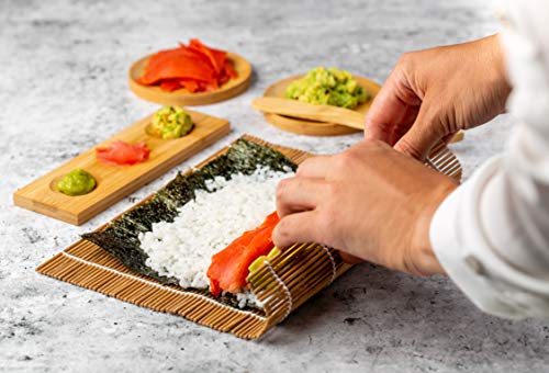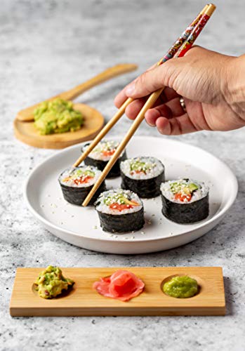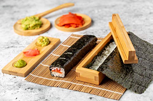 Natürlicher bambus: Unser umweltfreundliches Koch Set besteht zu 100 % aus natürlichem Bambus und enthält alle Werkzeuge, die Sie für das perfekte Sushi benötigen: 2-in-1 Futo Maki, Uramaki und Sushi-Form, Rollmatte, Saucenschalen, Essstäbchen und Reisverteilerpaddel.