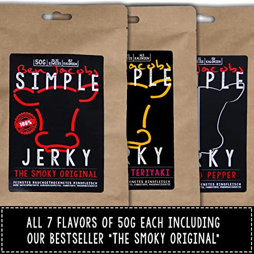 Details: Beef Jerky Probierbox, 7 x 50g, handgemacht, österreichisches Weiderind, Premium Trockenfleisch ohne chemische Zusätze