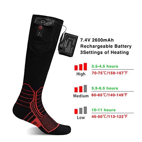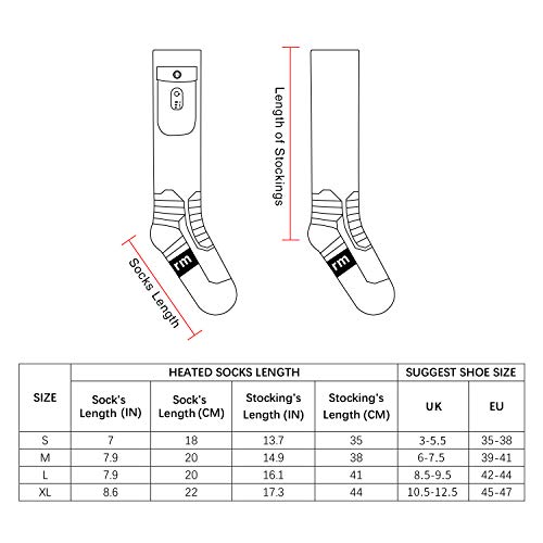 ❄7.4V 2600MAH wiederaufladbare Li-Ionen-Batterien – Wir haben 4 Größen von beheizten Socken. (S / M / L / XL: die Länge der Socken ist länger als andere.) Die Elektrosocken enthalten ein Paar wiederaufladbarer 7,4V 2600MAH Lithium-Polymer-Batterien. Aufheizen bis zu 3,5-11 Stunden und volle Aufladung ca. 3-4 Stunden. Auch ist es mit 3 Heizungsregler für Sie die Temperatur leicht einzustellen