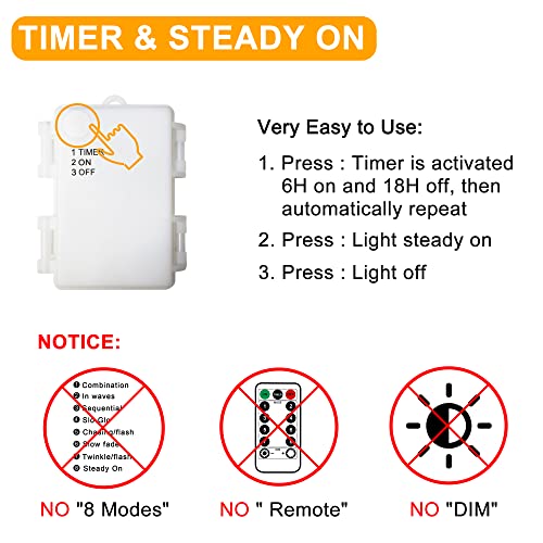 3*AA Batteriebetrieben:Fernbedienung weg! Modi weg! Entrümpelt und vereinfacht. Drücken Sie einmal: Timer wird aktiviert. Drücken Sie zweimal: Timer wird deaktiviert und Licht stets an. Drücken Sie dreimal: Licht aus. Sehr bequem und einfach zu bedienen, auch für ältere Menschen und Kinder können auch leicht verwendet werden. |
