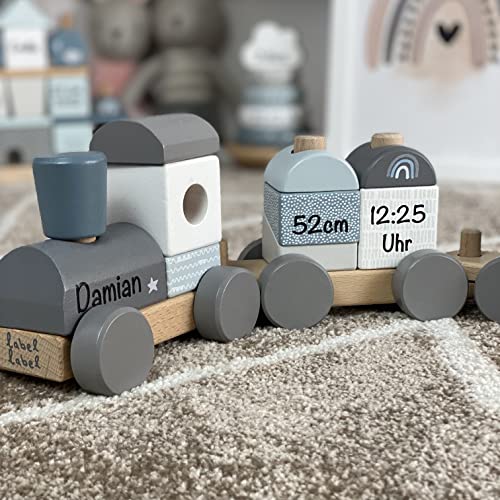 LABEL-LABEL SPIELZEUGEISENBAHN – HOLZZUG IN BLAU | BEDRUCKT PERSONALISIERT MIT GEBURTSDATEN & NAME