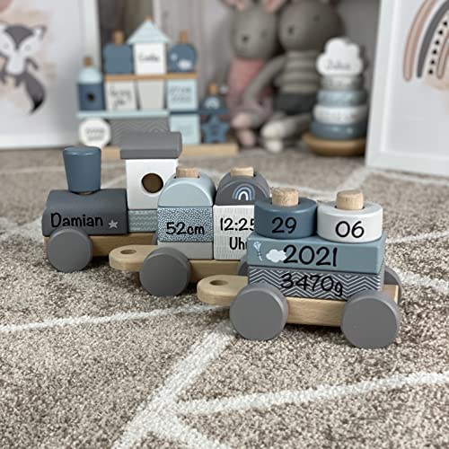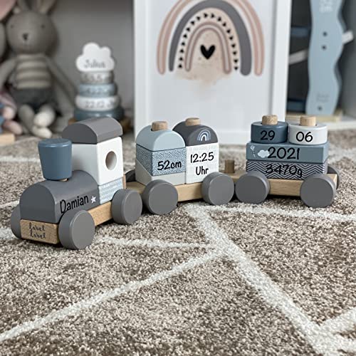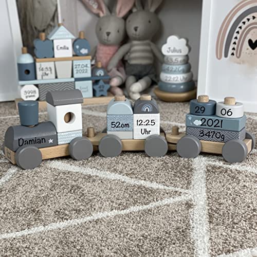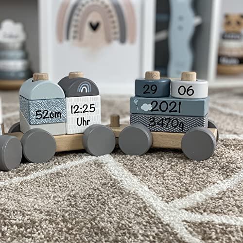 * PERSONALISIERTES GESCHENK – Der blaue Holzzug für Jungs kann auf Wunsch mit den Geburtsdaten und dem Namen des Kindes bedruckt personalisiert werden, so hältst Du die Erinnerungen an der Geburt fest