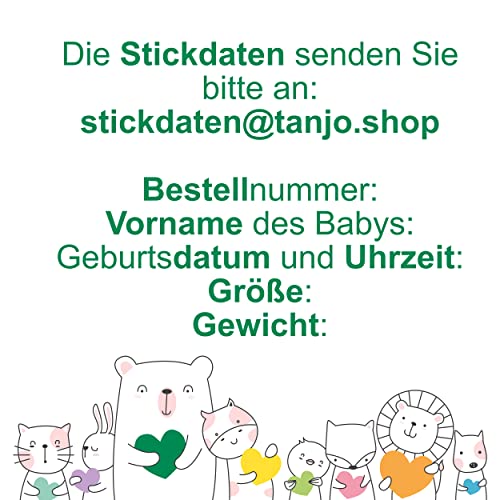 - Schicken Sie einfach die Stickdaten (Vorname des Kindes, Geburtsdatum, Größe und Gewicht) sowie die Bestellnummer nach der Bestellung an Tanjo. Die E-Mail-Adresse finden Sie oben im zweiten Produktbild.