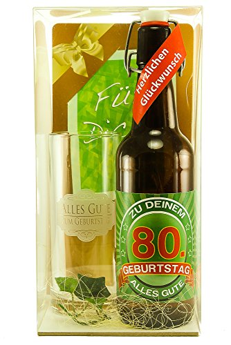 Bierset zum 80. Geburtstag gefüllt mit einer Fl. 0,5ltr Pilsner Bier mit Etikett, ein Glasbierkrug 0,3 ltr. mit Laser Gravur Herzlichen Glückwunsch und Dekoration. Liebevoll verpackt in einer Geschenkbox 13x13x28 cm. Das Bier wird gebraut von der fränkischen Traditionsbrauerei Göller und ist nach Auslieferung mindestens 3 Monate haltbar. Zutaten: Brauwasser, Gerstenmalz und Hopfen, 4,9%alc. Gebraut nach deutschem Reinheitsgebot.