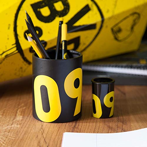 Natürlich darf Schule auch Spaß machen. Mit den Schulartikeln vom BVB macht Ihr schon mal einen guten Anfang und zeigt Eurem Banknachbar gleich für wen Euer Fußballherz schlägt.Spitzen Team Der Tonnenspitzer ist natürlich in Schwarzgelb gehalten und fährt alles auf, was ein echter Borusse in der Schule benötigt. Das BVB-Logo darf natürlich auch nicht fehlen, um auch jedem im Klassenzimmer zu zeigen, welcher Fußballverein in eurem Herzen wohnt. So läuft das auch mit der Schule.