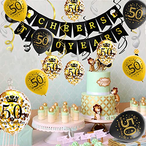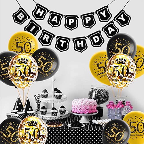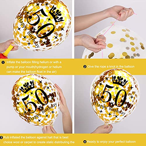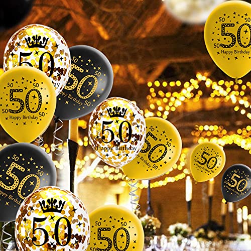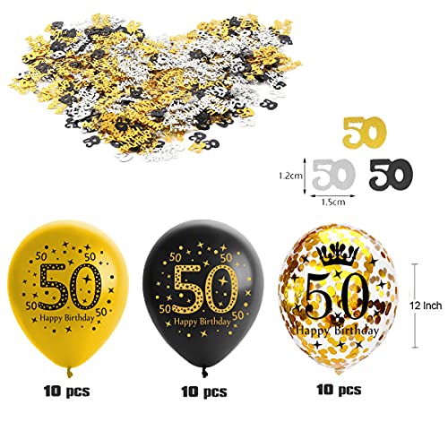 30 Stück 12-Zoll-Latexballons: 10 schwarze Ballons, 10 Metallgoldballons und 10 bedruckte Goldkonfettiballons. Jeder Latexballon ist mit einem einzigartigen Muster zum 50. Geburtstag bedruckt. 20 Gramm Konfetti aus Schwarz, Silber und Gold.