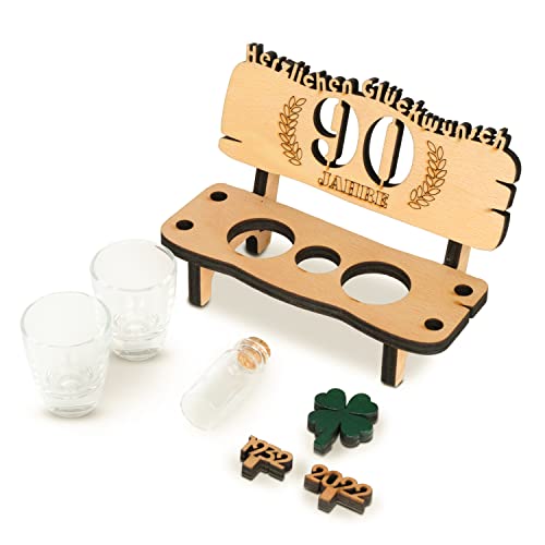 🌳 Schnapsbank aus Holz Buche geölt – hergestellt von uns in Deutschland + 2 Schnapsgläser in Gastronomiequalität der Marke Arcoroc hergestellt in Frankreich + ein grünes Kleeblatt + 2 passende Jahreszahlen + und ein Glasfläschchen mit Korken zur Dekoration. Die Schnapsbank wird zusammen mit zwei Schnapsgläsern aus Echtglas geliefert. Diese sind für die Reinigung in der Spülmaschine geeignet.
