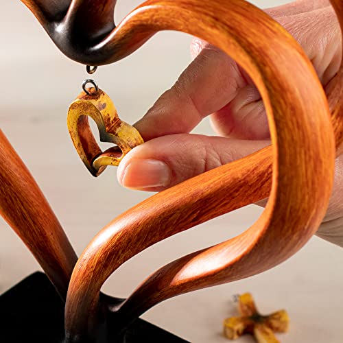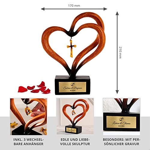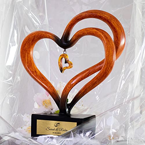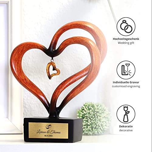 Details: Casa Vivente Herz-Skulptur in Holz-Optik für Paare mit 3 Anhängern, Personalisiert mit Namen und Datum…