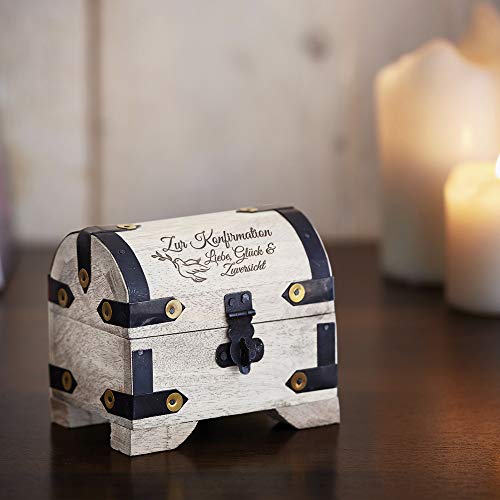 Details: Casa Vivente Kleine Schatztruhe mit Gravur zur Konfirmation, Motiv Taube, Vintage Bauernkasse – Weißes Holz, Messing…