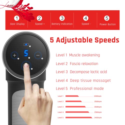 EASY TO USE – Eliminate tedious operations and use a user-friendly touch panel design to ensure that each user can use it immediately after receipt. This massage gun has 5 speed settings to meet your massage needs.