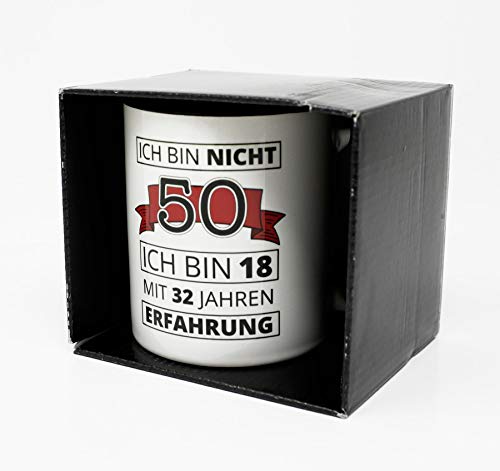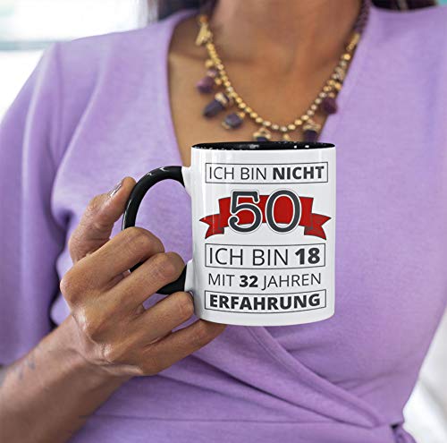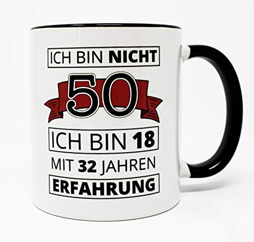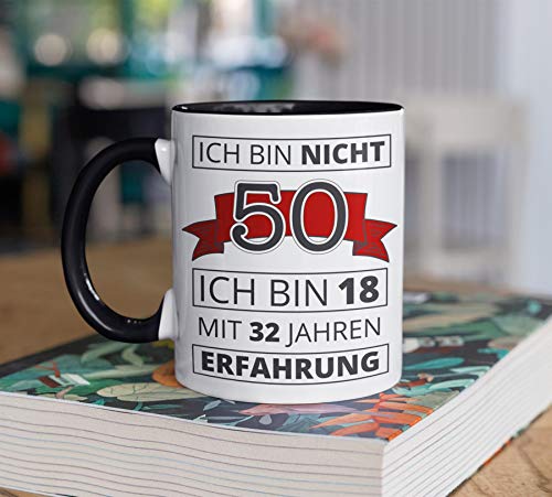 DESIGN: Stylische & moderne Tasse mit dem Spruch: Ich bin nicht 50 ich bin 18 mit 32 Jahren Erfahrung. Mit schwarzem Henkel, schwarzer Innenseite und roter Banderole.