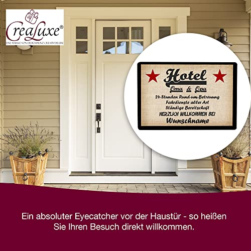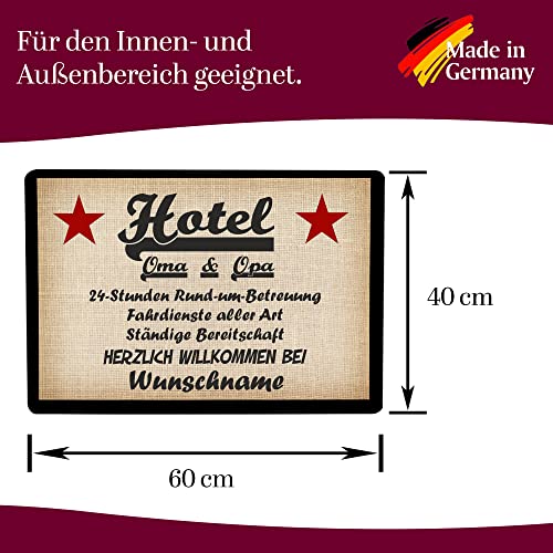Details: Crealuxe Fussmatte Herzlich Willkommen (Wunschname / Wunschtext) Hotel Oma & Opa – 60×40 cm – Gummi Rückseite…