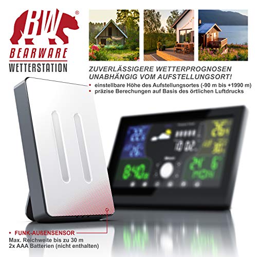 Wussten Sie, dass der Luftdruck mit zunehmender Höhe abnimmt? Auf Meereshöhe beträgt er durchschnittlich 1 bar (1013 hPa), auf der Zugspitze nur noch 0,7 bar. Für die Wetterprognose ist aber der Luftdruck ein entscheidender Wert. Weshalb Sie bei der Bearware Wetterstation die Höhe des Aufstellungsortes eingeben können! Dank dieser Höhenkorrektur werden die Berechungen auf Basis des örtlichen Luftdrucks erstellt und Sie erhalten zuverlässigere Prognosen.